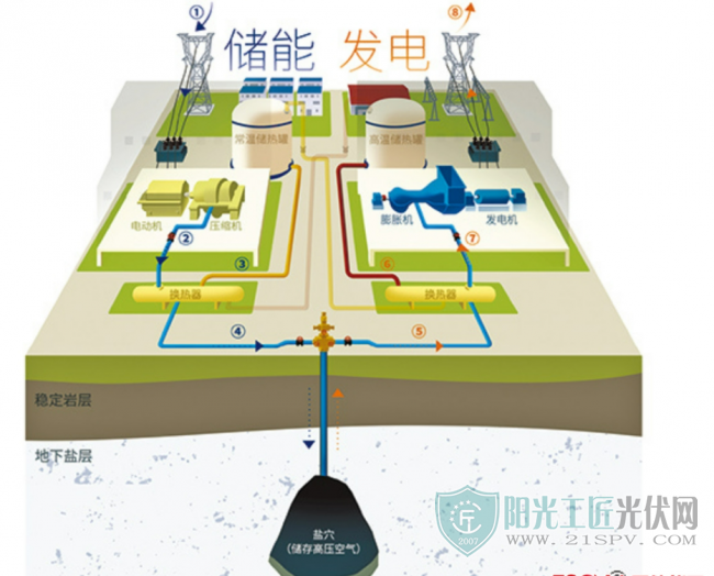 壓縮空氣的進程中,空氣溫度會增加到300多攝氏度。為了確保系統運行的安全,需求將高溫高壓空氣冷卻到40攝氏度左右的常溫高壓空氣。這些熱量并沒有被糟蹋掉,而是被換熱器“取”出來貯存在導熱油之中,存放在地面上的大型高溫導熱油罐里。就這樣,經過夜間“充電”,電能被轉化為空氣勢能和熱能。